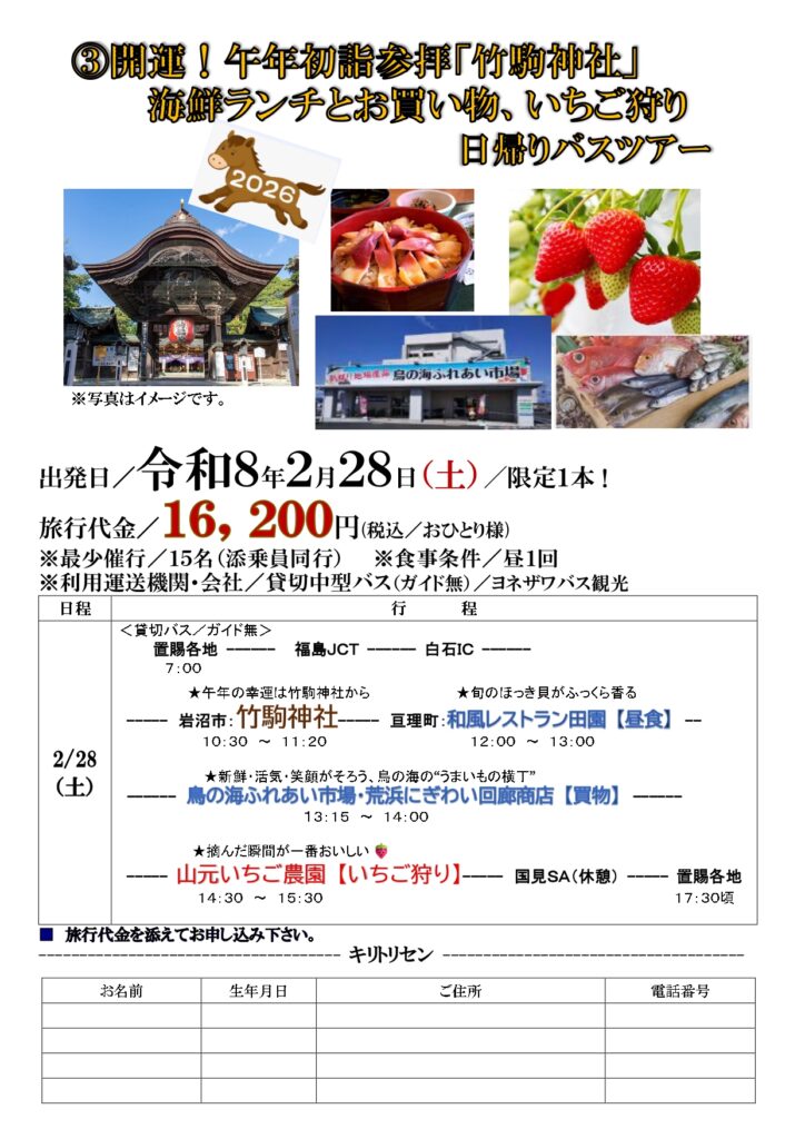 商品紹介2025.12.17 ③開運!午年初詣参拝「竹駒神社」海鮮ランチとお買物、いちご狩り日帰りバスツアー 募集中! ツイート シェア はてブ 送る Pocket FOLLOW Instagram シェアしてね! ツイート シェア はてブ 送る Pocket CONTACT旅行に関するご相談はこちら 電話で問い合わせる場合 0238-23-0919営業時間:月~金9:30〜18:00 土9:30~13:00 (定休日:日・祝日) メールで問い合わせる場合 メールフォームを開く