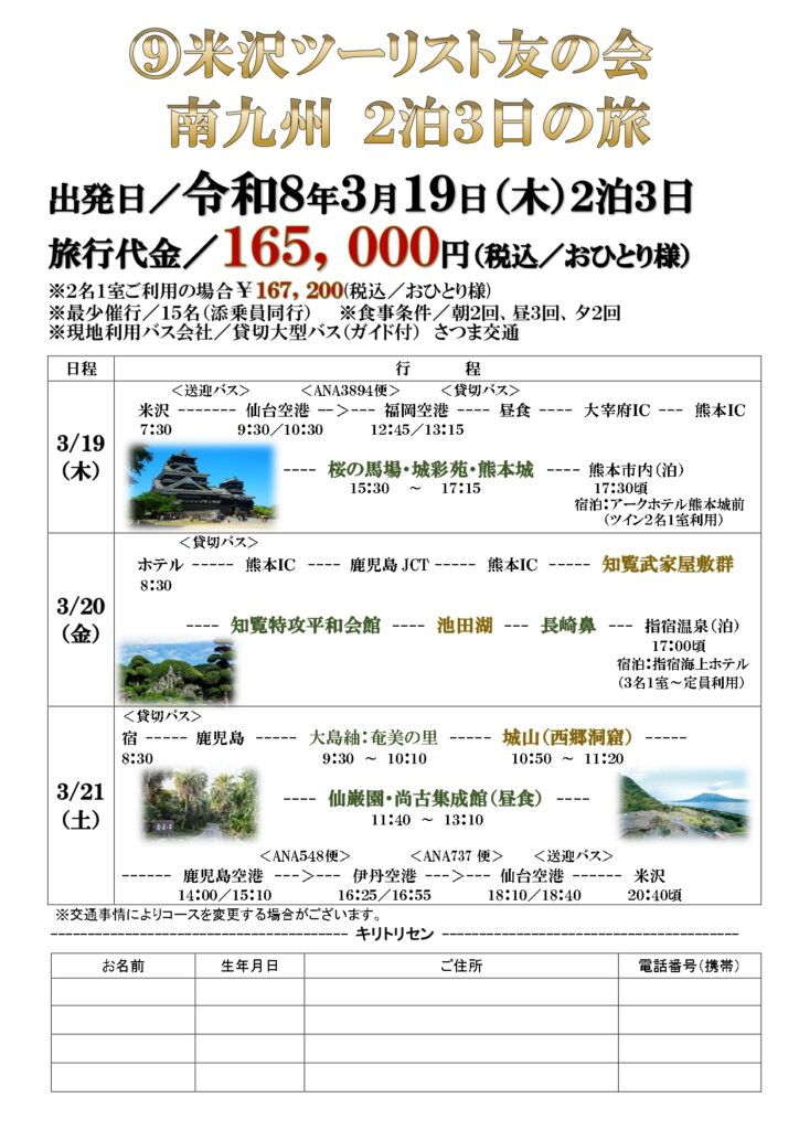 商品紹介2025.12.17 ⑨米沢ツーリスト友の会 南九州2泊3日の旅 募集中! ツイート シェア はてブ 送る Pocket FOLLOW Instagram シェアしてね! ツイート シェア はてブ 送る Pocket CONTACT旅行に関するご相談はこちら 電話で問い合わせる場合 0238-23-0919営業時間:月~金9:30〜18:00 土9:30~13:00 (定休日:日・祝日) メールで問い合わせる場合 メールフォームを開く